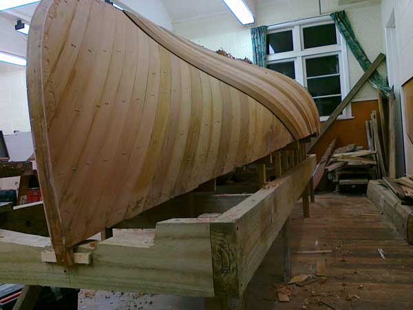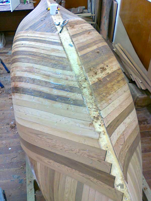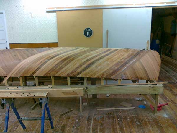 Over the past 2 sets of Monday/ Tuesday night classes, me and my volunteers have got lots done. Averaging around about 14 strips cut and tacked down on my official Monday night classes. I have been unofficially attending the Tuesday class as well to get the strips glued. This helps to keep up the pace and hopefully get the hull done before the impending shift of the boat school in November.