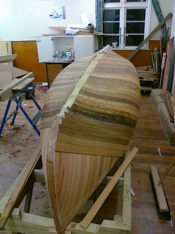 A lovely Zephyr Racing Dinghy is shown here too, nearly complete in raw timber, professionally built for a customer by the resident boat builder, Mark. It is also made with the 3-skin cold moulding technique like my boat- but with 90mm wide Hoop Pine strips.