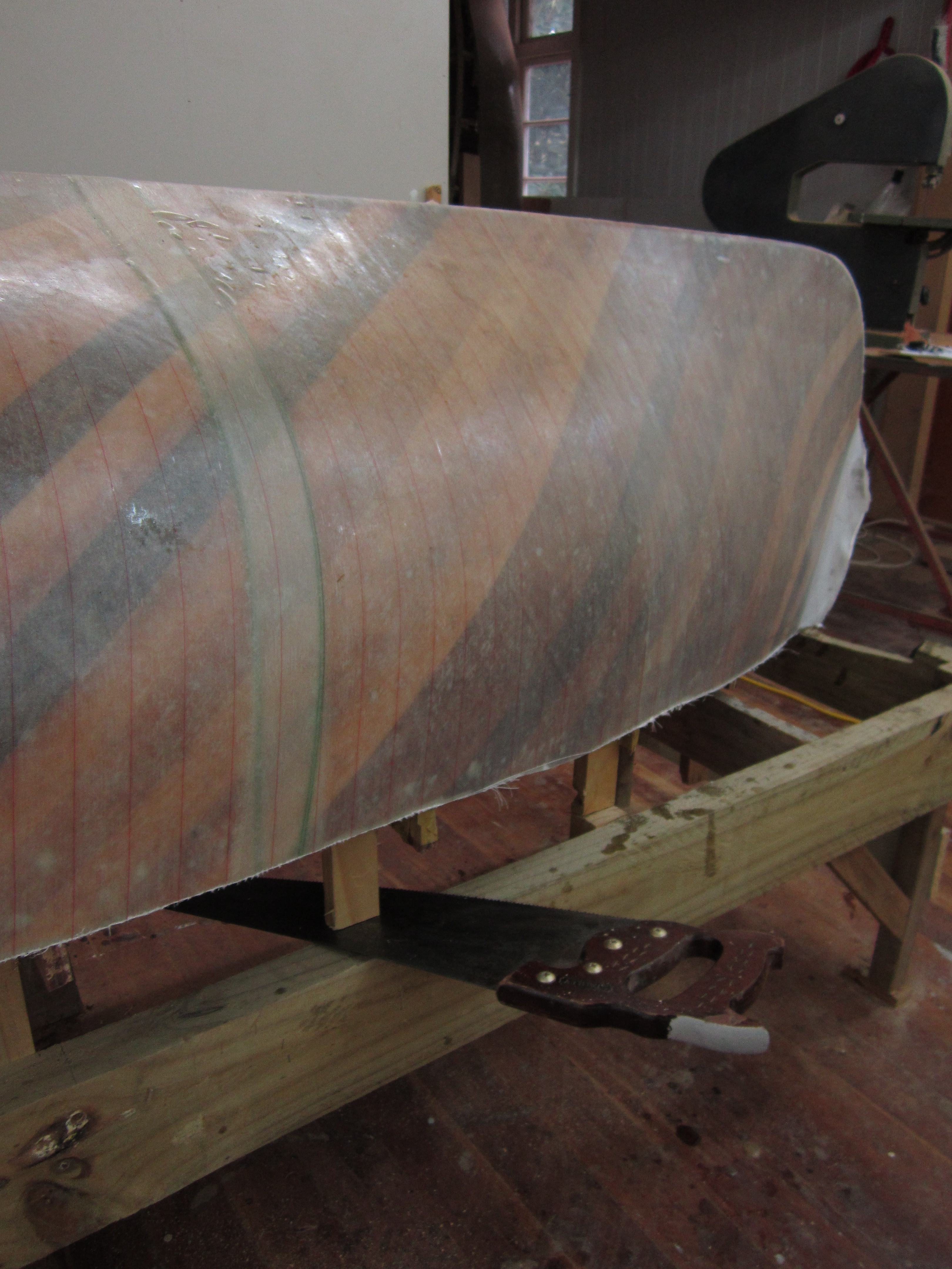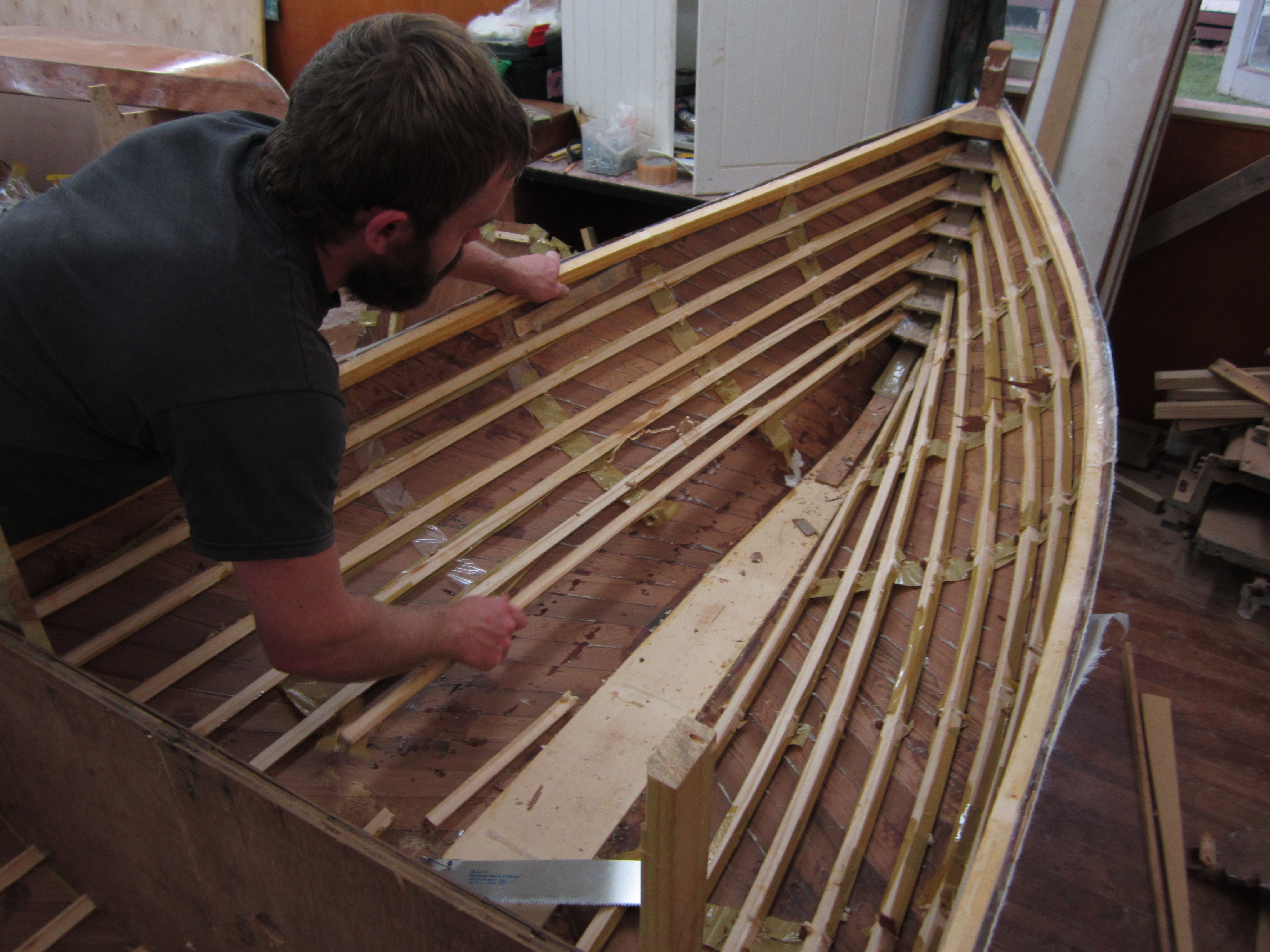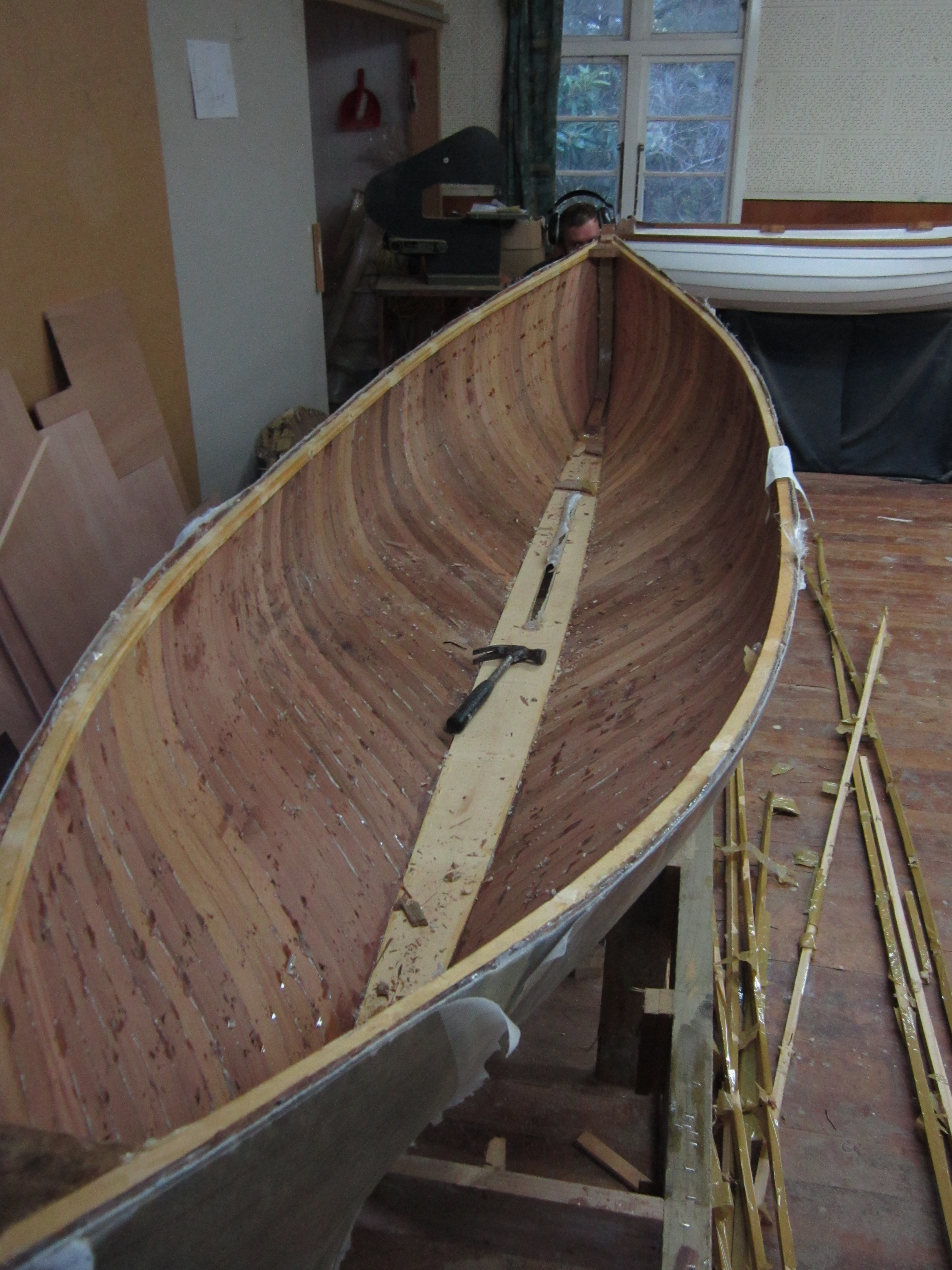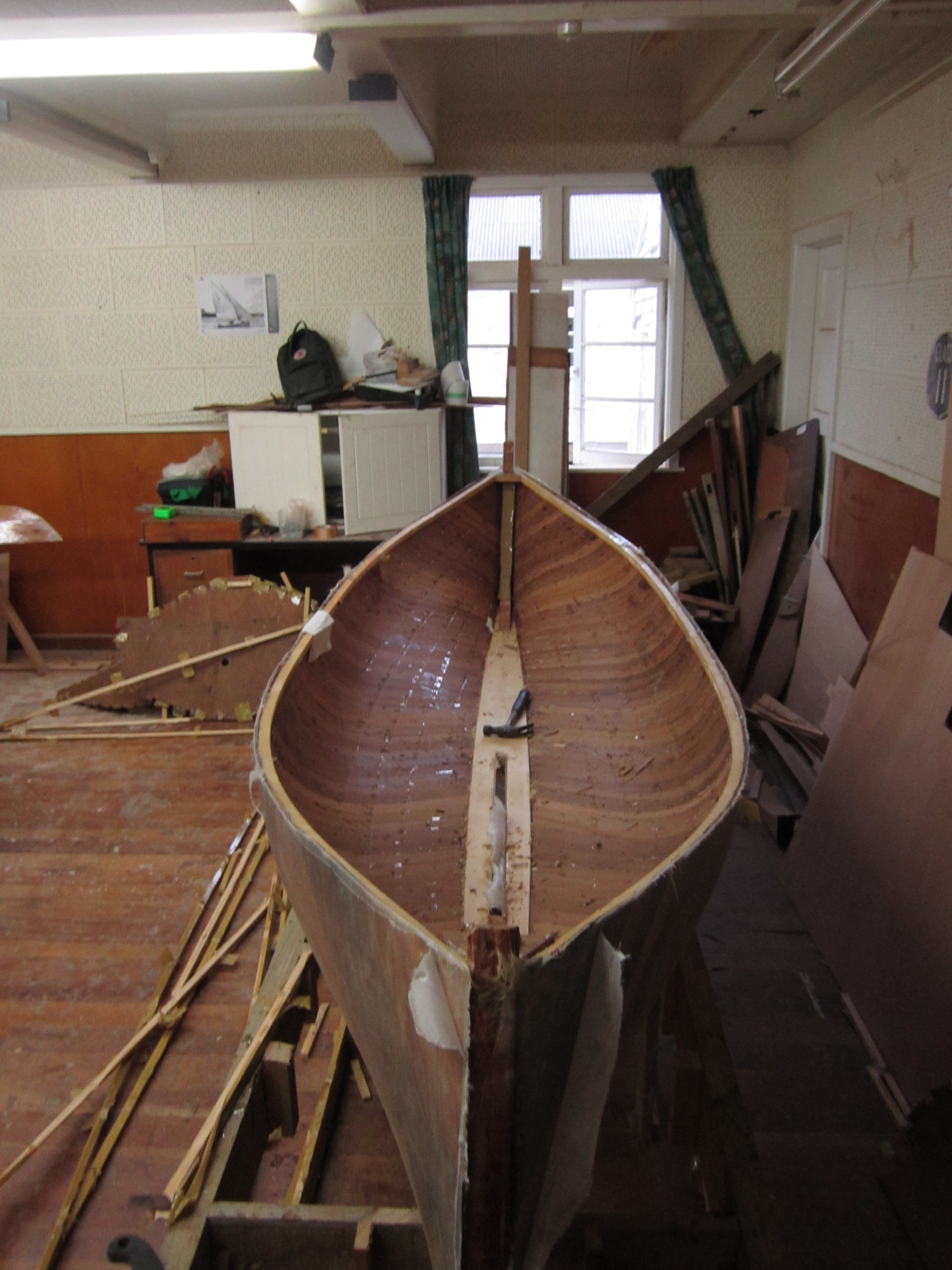 The shell of the boat is now strong enough to stand alone, so we chopped it off it’s foundations and turned it over then removed the temporary moulds and ribbands or “skeleton” with a hammer.