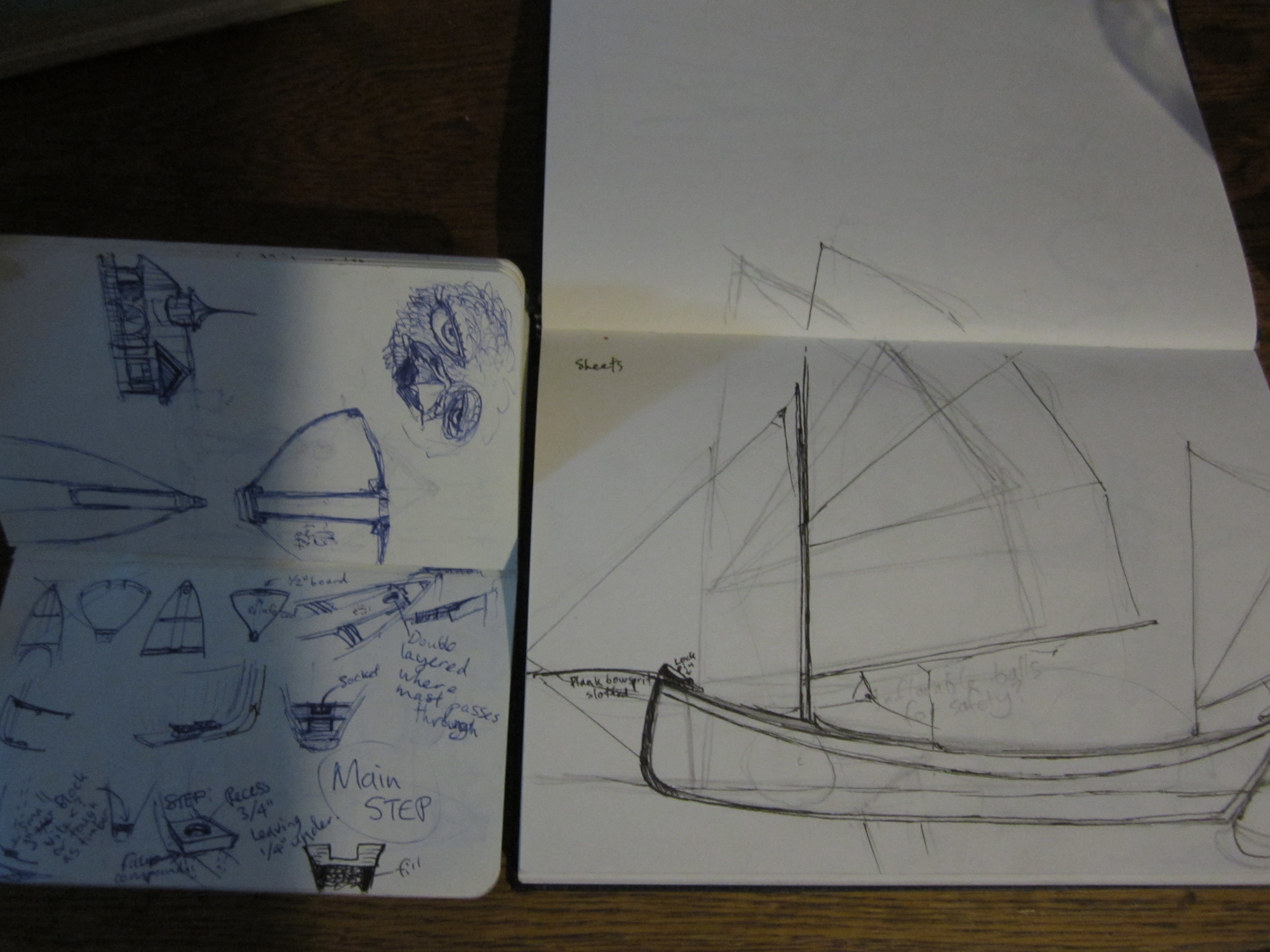 And speaking of the design, Below is a small sample of the notebook sketching and flow of thought that is basically my crude visual notes. These are some brainstorming ideas of mast step construction details and an optional bowsprit racing-rig. This boat is designed and built intuitively, with very little in the way of mathematics and measurement. The only real technical drawing has been pencil and paper lines drawing of the hull form and a few rough sail plan geometry balance calculations. In the 1880s and 1890s era, many boats were still designed and built intuitively, with a few basic dimensions and sketches- only the people who did so would usually have had more experience and a pattern of learned construction details based on their father’s father’s father’s way. It’s just how I like to work on my own project, at my own (slow) pace. I have to make up the details from scratch to suit my design and the more modern epoxy-wood composite. It has turned into a creative/functional art process.