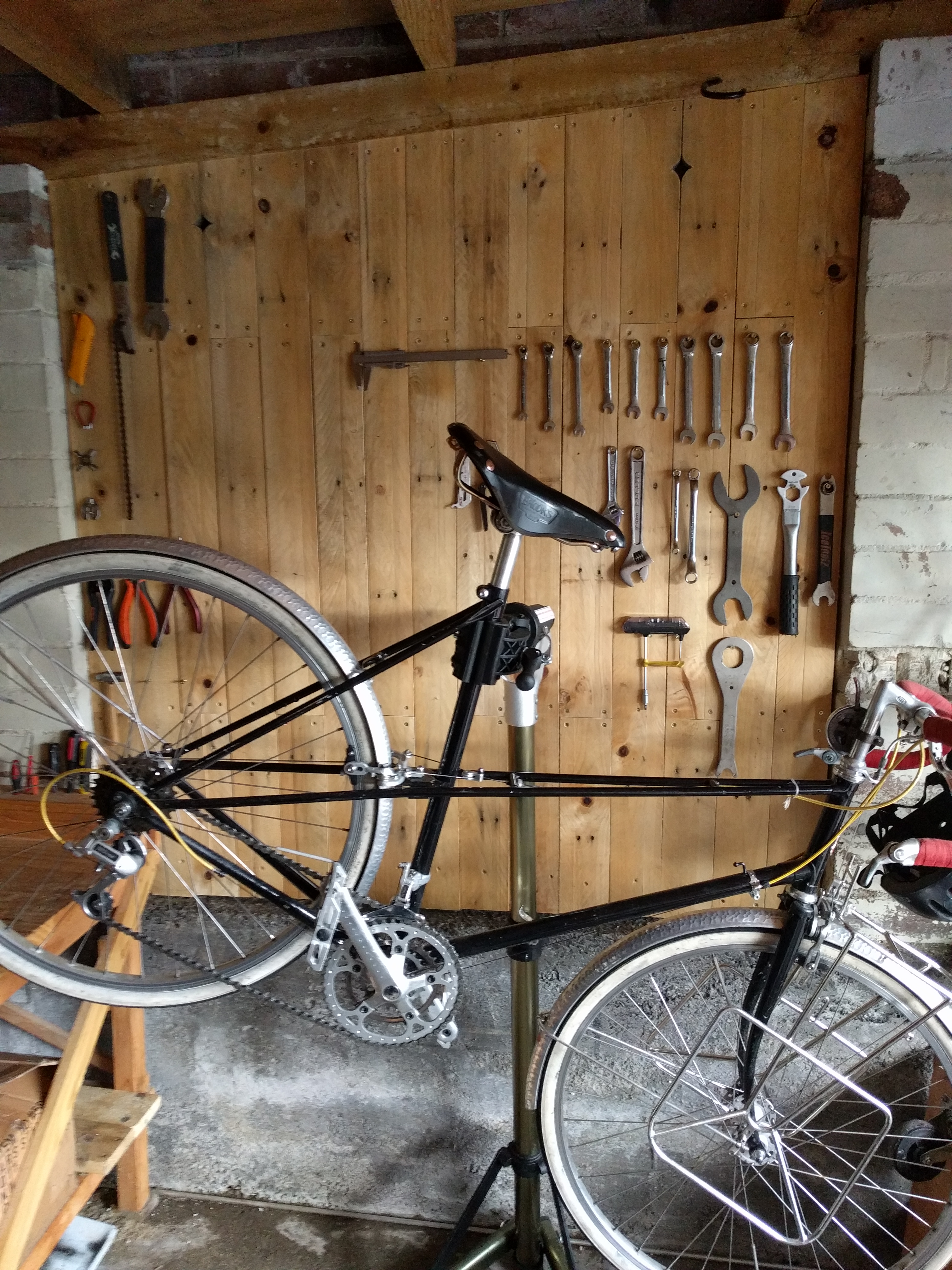 After a very long gap in posting here, time for an update on my latest project.. as part of amping up my Joscat Craft creative practice this winter, I have begun fitting out my wee garage to use as a tiny workshop. It’s now up and running as a multi-purpose work-space. On one side is a bicycle toolwall with a workstand to repair vintage and classic bikes.. (lately I’ve been converting some 80’s MTBs into commuters).. and on the other side is a large all- round workbench ontop of which sits my stored sailing canoe (the boat is 90% finished.. on hold due to becoming a dad.. will post more about the boat later)..This bench I plan to continue developing to improve timber and tool storage underneath, and add a built in router table and carpentry vice.