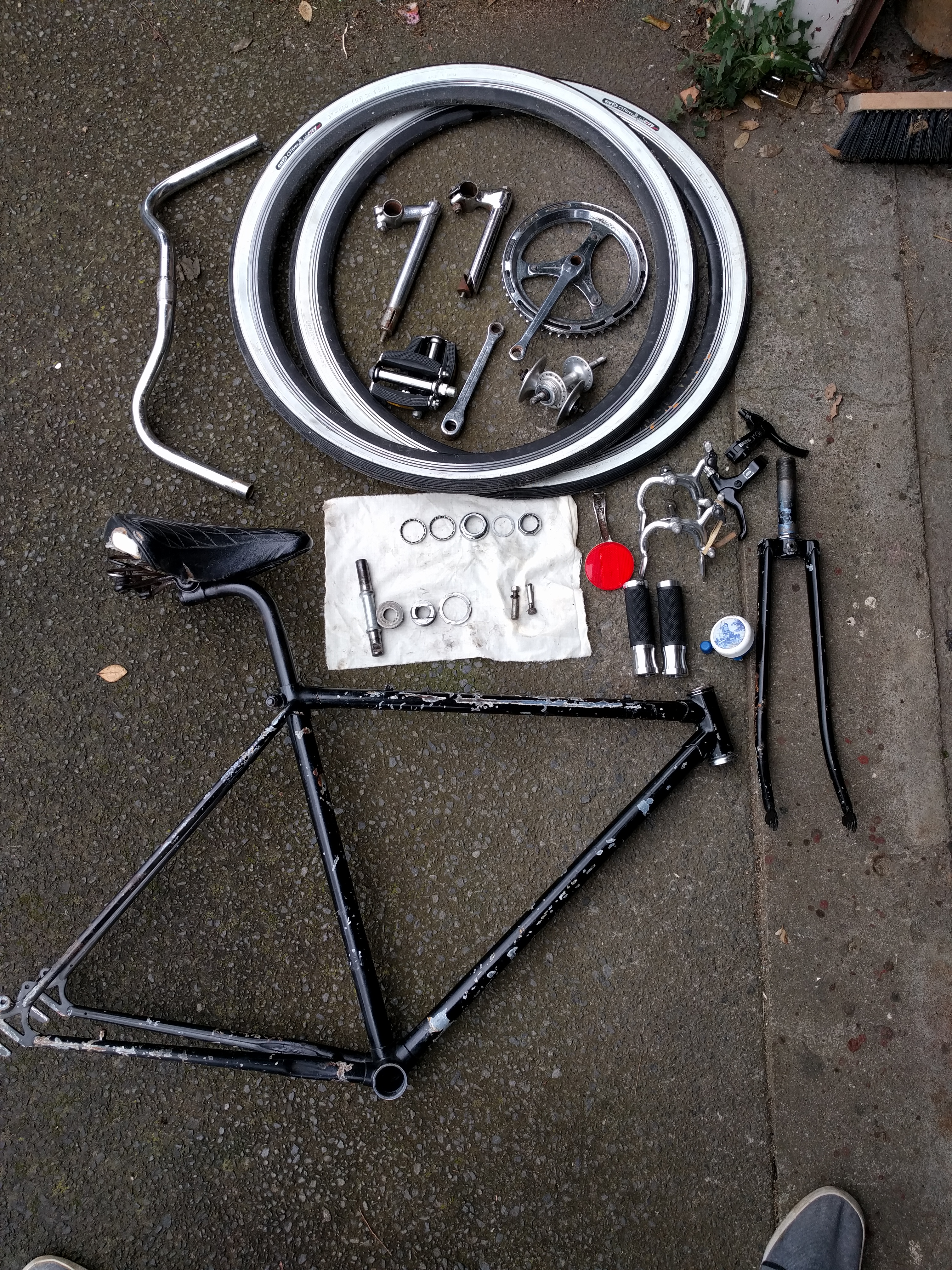Julian at Maloney’s Barbershop brought me a curious mid 70s beaten up old dusty Raleigh Arena that had been remodeled several times, leaving an interesting patina of paint layers. He asked me to give it a once over, with the idea to install a handmade wooden sign into the frame to park it outside the shop as advertising. One thing led to another, and this project became a a serious rebuild with a fully custom hand-laced wheel set, new brakes, every part cleaned/ overhauled or replaced entirely with gems from my private bike parts collection..
