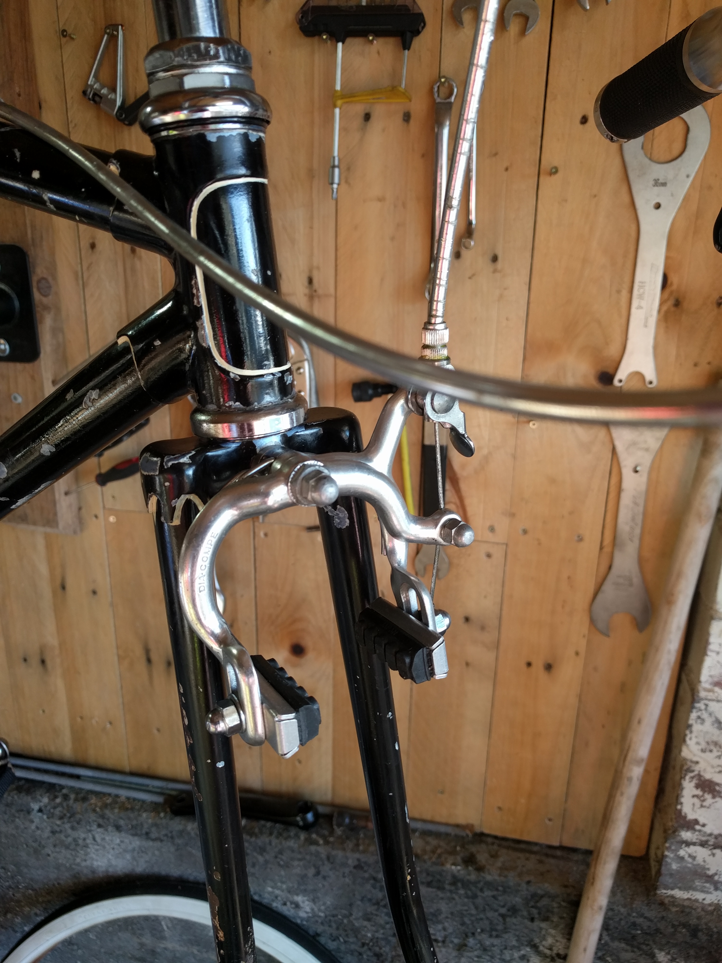 Julian at Maloney’s Barbershop brought me a curious mid 70s beaten up old dusty Raleigh Arena that had been remodeled several times, leaving an interesting patina of paint layers. He asked me to give it a once over, with the idea to install a handmade wooden sign into the frame to park it outside the shop as advertising. One thing led to another, and this project became a a serious rebuild with a fully custom hand-laced wheel set, new brakes, every part cleaned/ overhauled or replaced entirely with gems from my private bike parts collection..