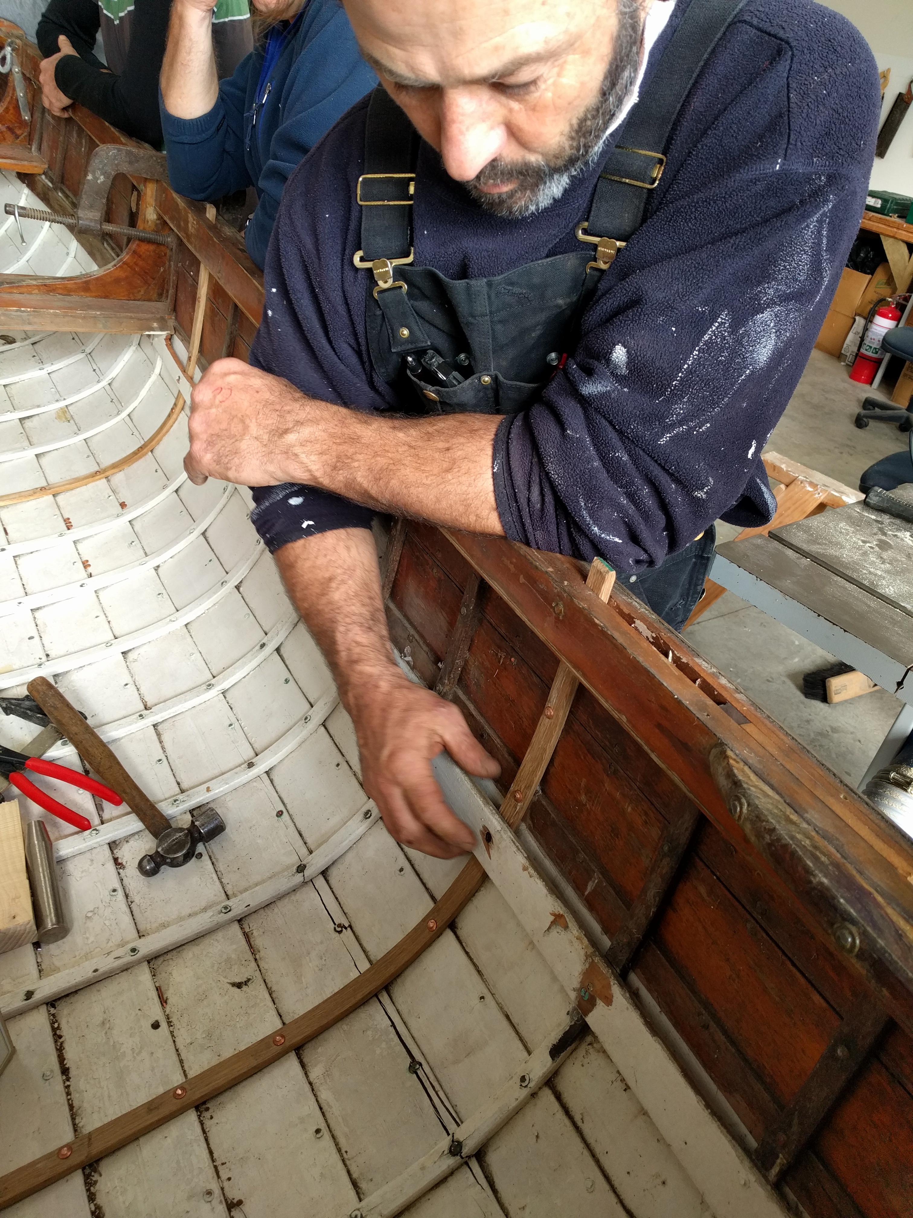 Talented boatbuilder and tutor Paul Tingy ran us through theory of bracing up an old distorted hull, stripping out damaged ribs, steam bending white oak, riveting with copper boat nails and roves.