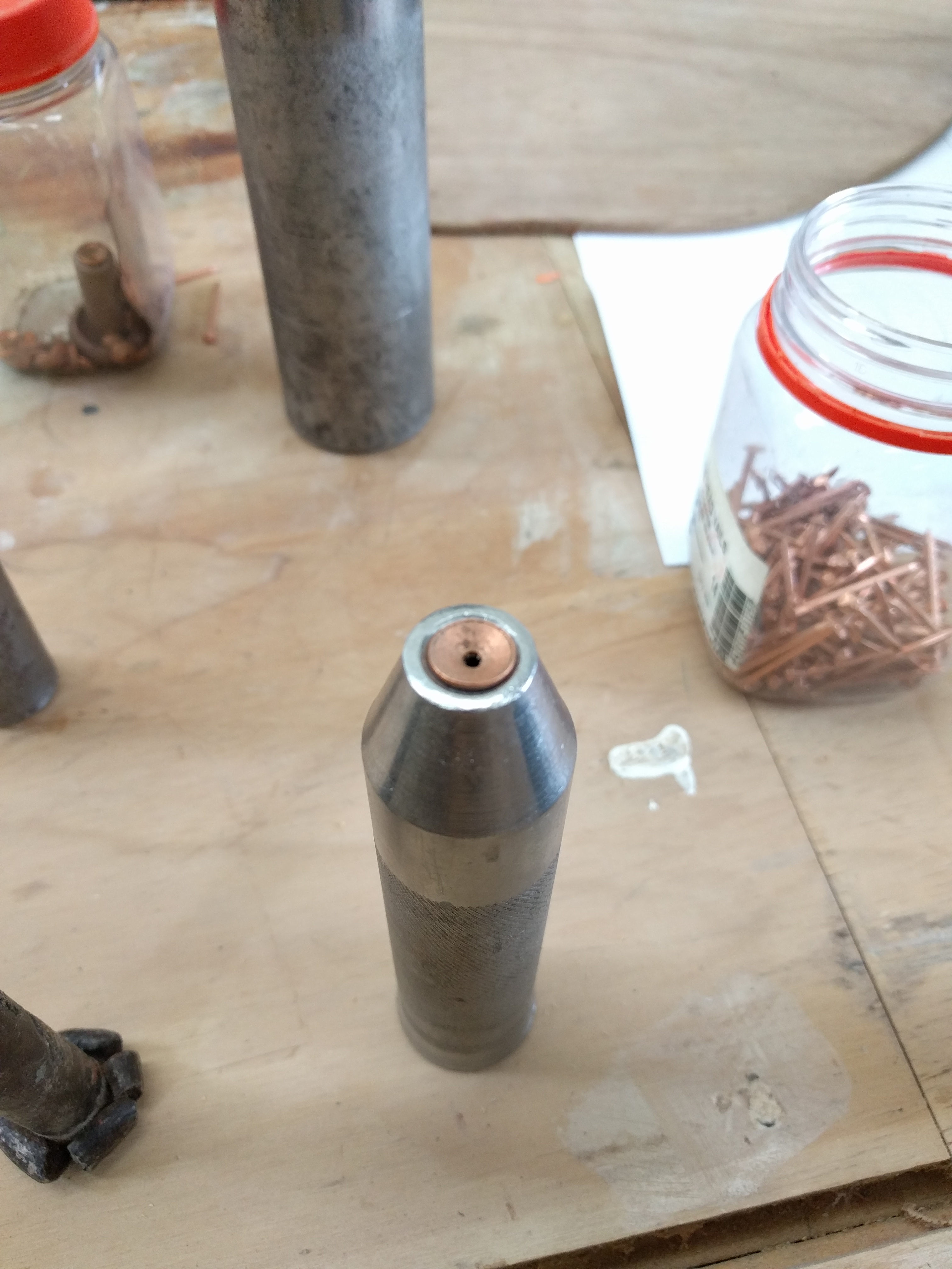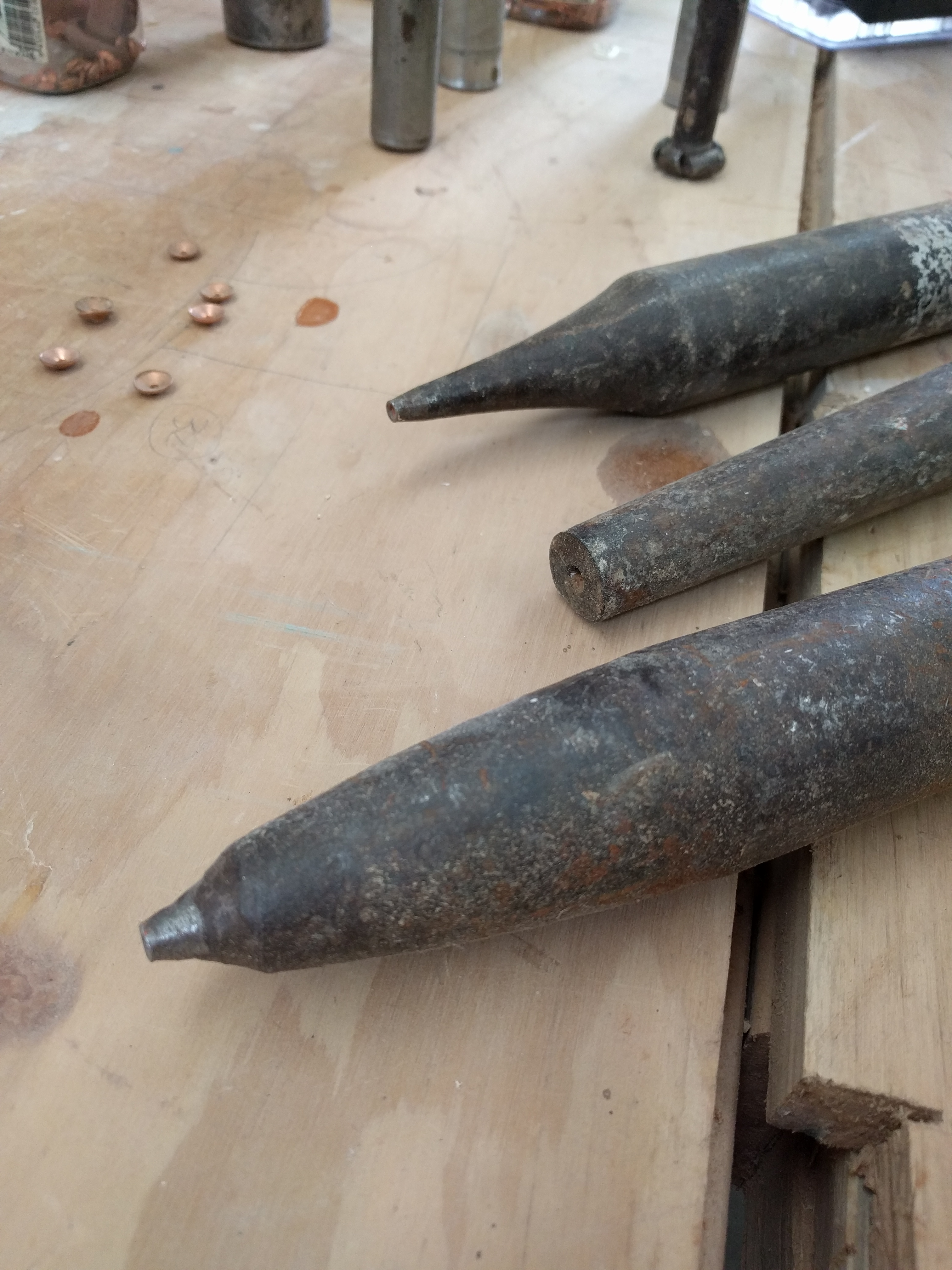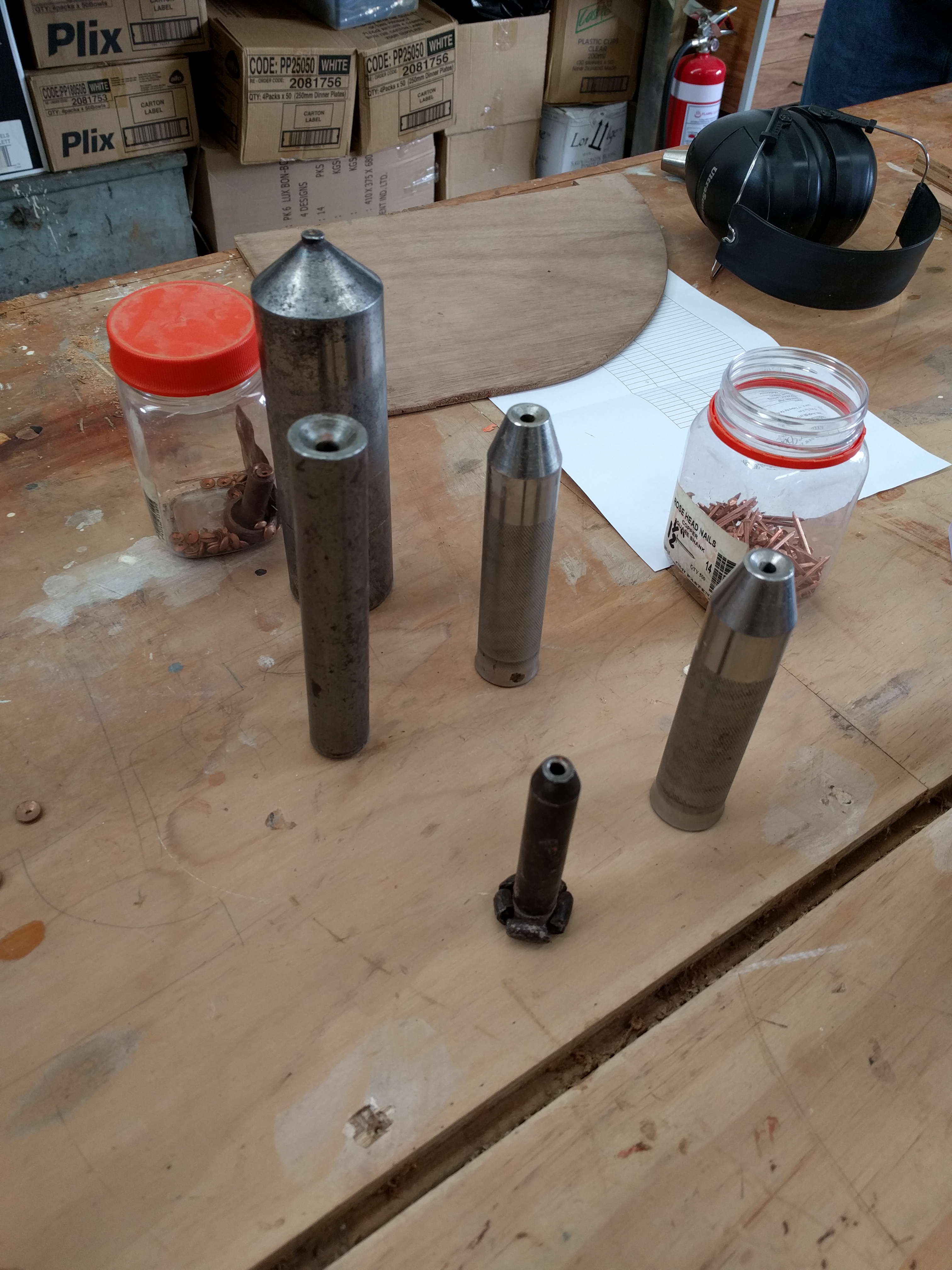 An indulgent time was had by all, messing about with a hot steambox pumping out the smell of oak tannins. The worn smooth feel of hand- lathed dollies and rove-punches weighed awkwardly in our novice hands, and the loud tick-tick of ball peen hammers drowned our clumsy efforts to communicate among ourselves as we attempted teamwork. Riveting away at the old wooden hull certainly required coordination: someone on the outside alternately hammering nails into the boat and then holding a dolly over the nail to stop it wiggling out again; while someone else on the inside was tapping rove washers onto the spikes with a rove punch, then snipping off and mushrooming over the copper nail stump with a ball peen.