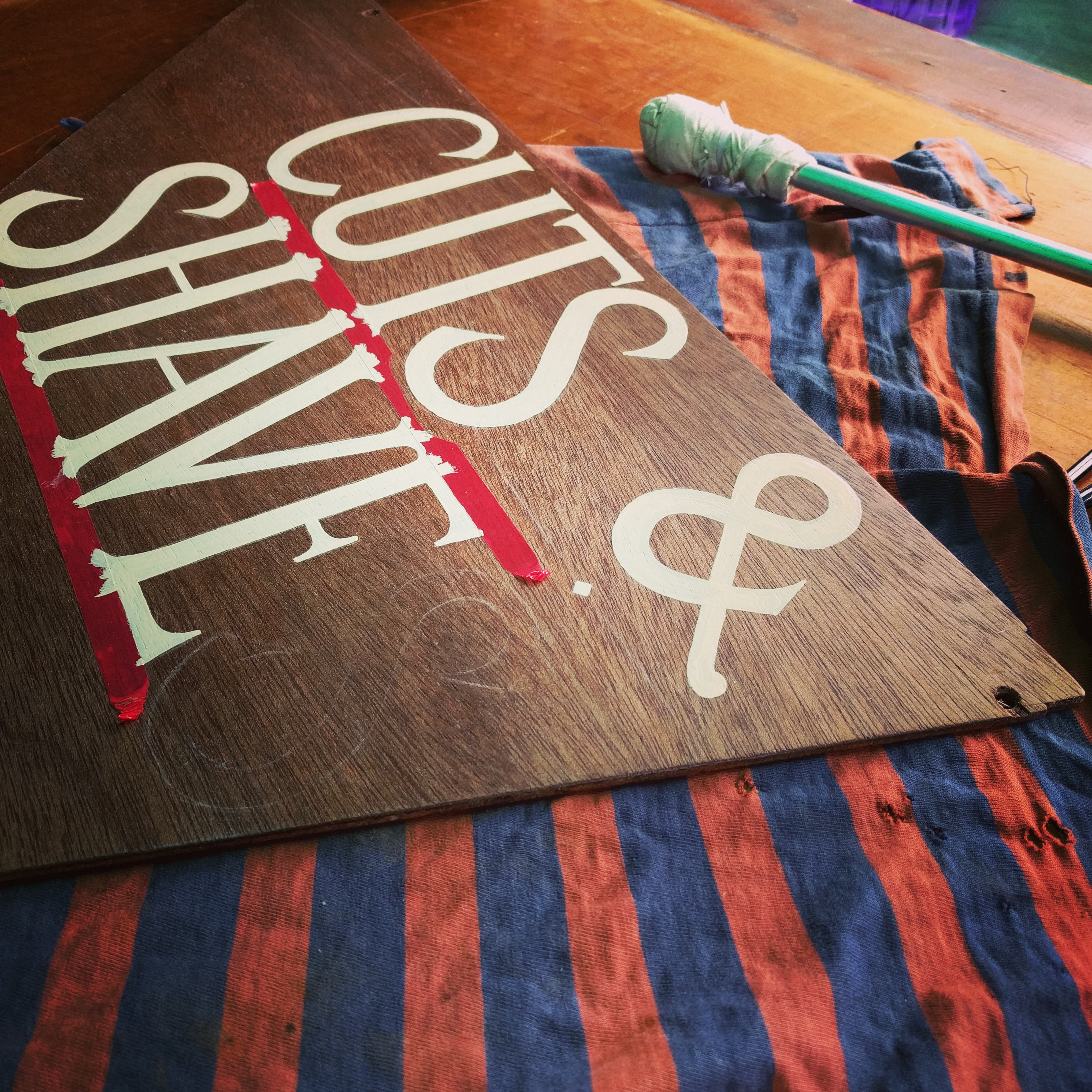 As the bike is being used and parked outside the barber shop, the sign itself for this needed to be light and durable in the outdoors; so I used a bit of 4mm meranti BS1088 grade marine plywood (offcut from my boatbuilding). I treated it with a few wipe-finish coats of spar varnish to seal the grain and allow the lettering paint to flow onto a smooth surface. Then some careful sketching, transferral of the layout with dressmakers carbon paper. Following that some happy hours were spent with some careful brushwork, using One Shot lettering enamel, and sable hair lettering brushes.