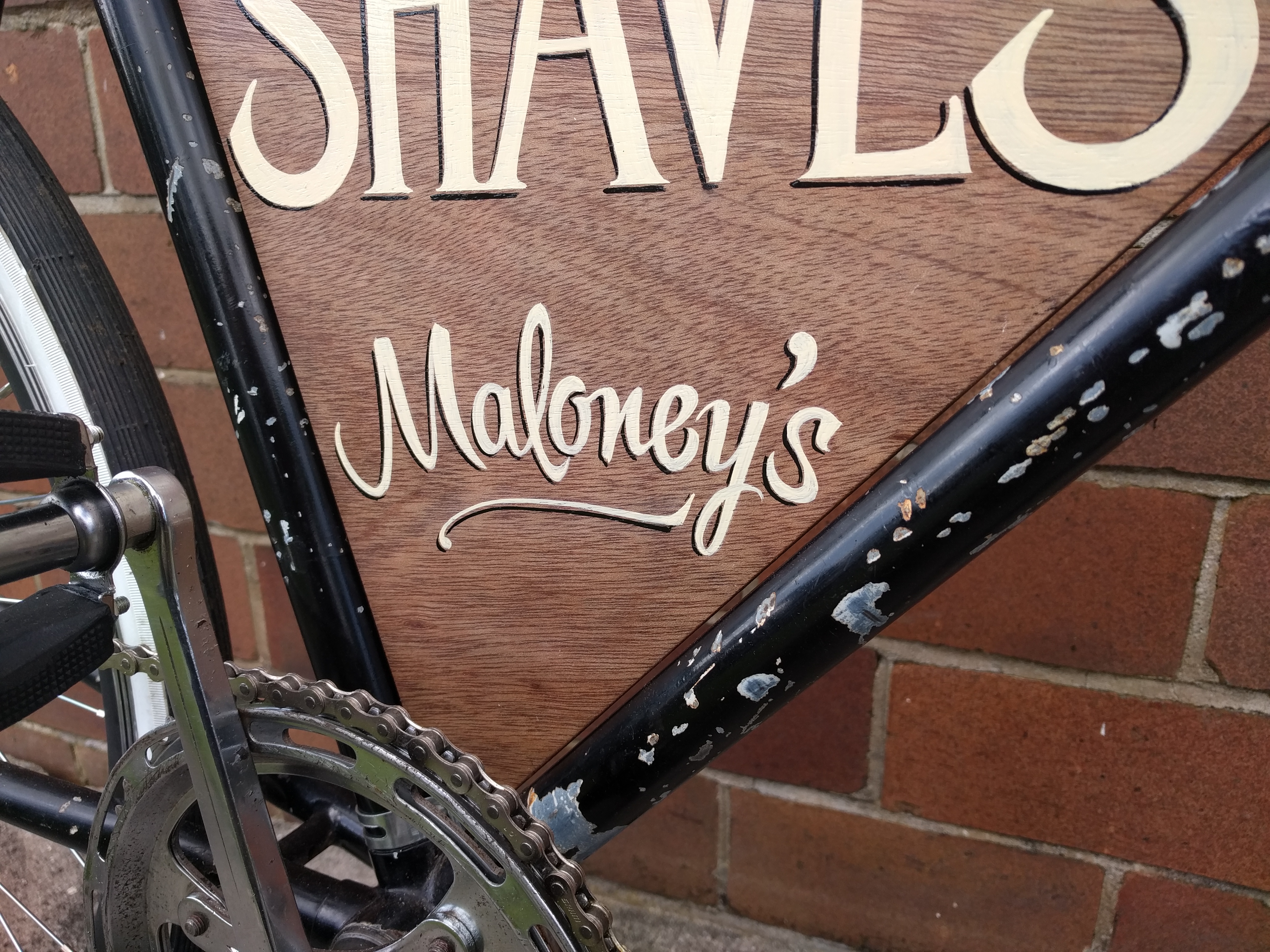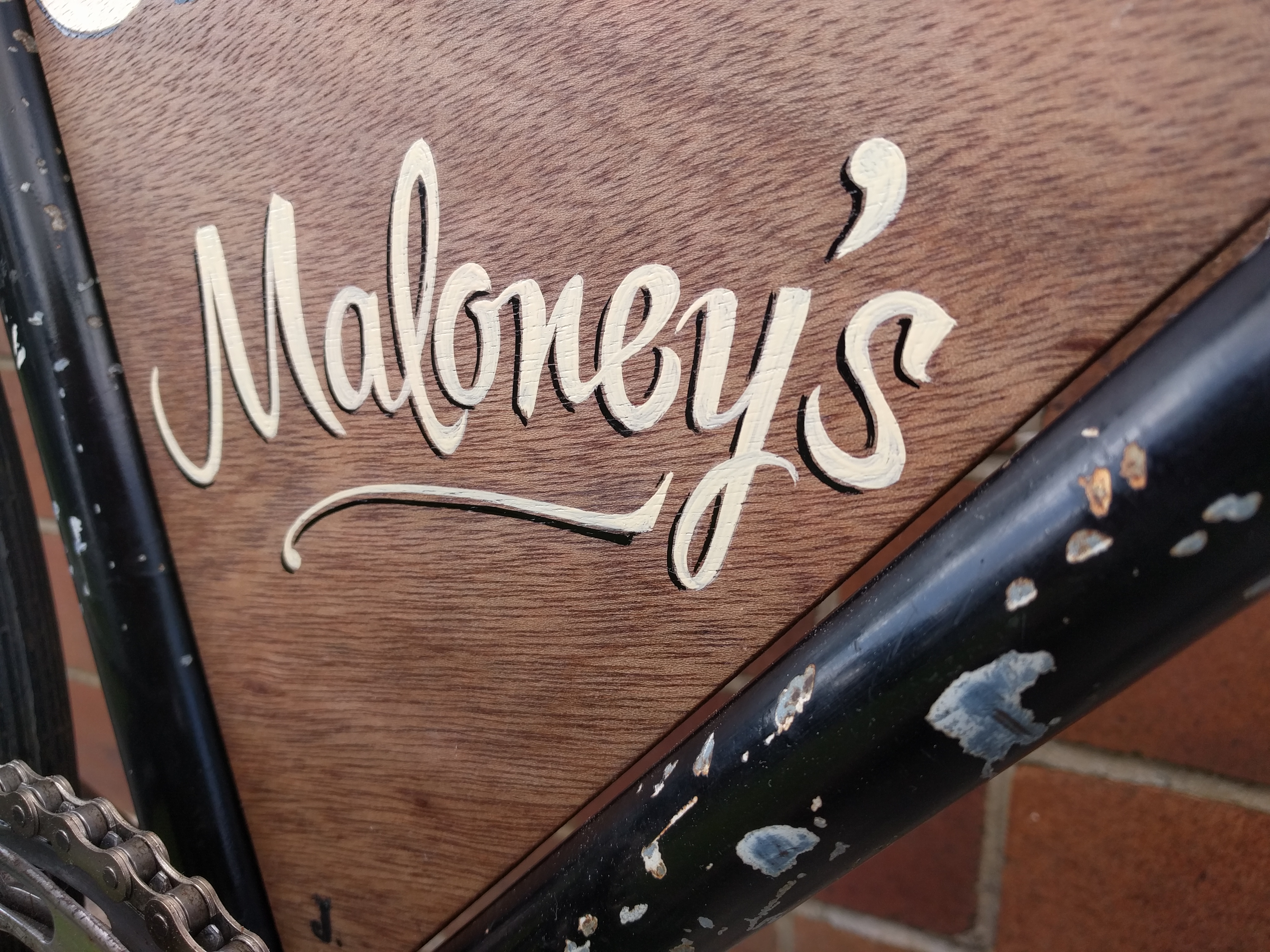 I’m quite proud of this result, and really enjoyed the process, as I got to draw on several skill sets: my many years of experience fixing old bikes, woodwork skills and my relatively new-found passion for handpainted signs.